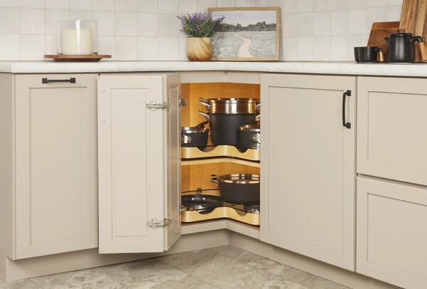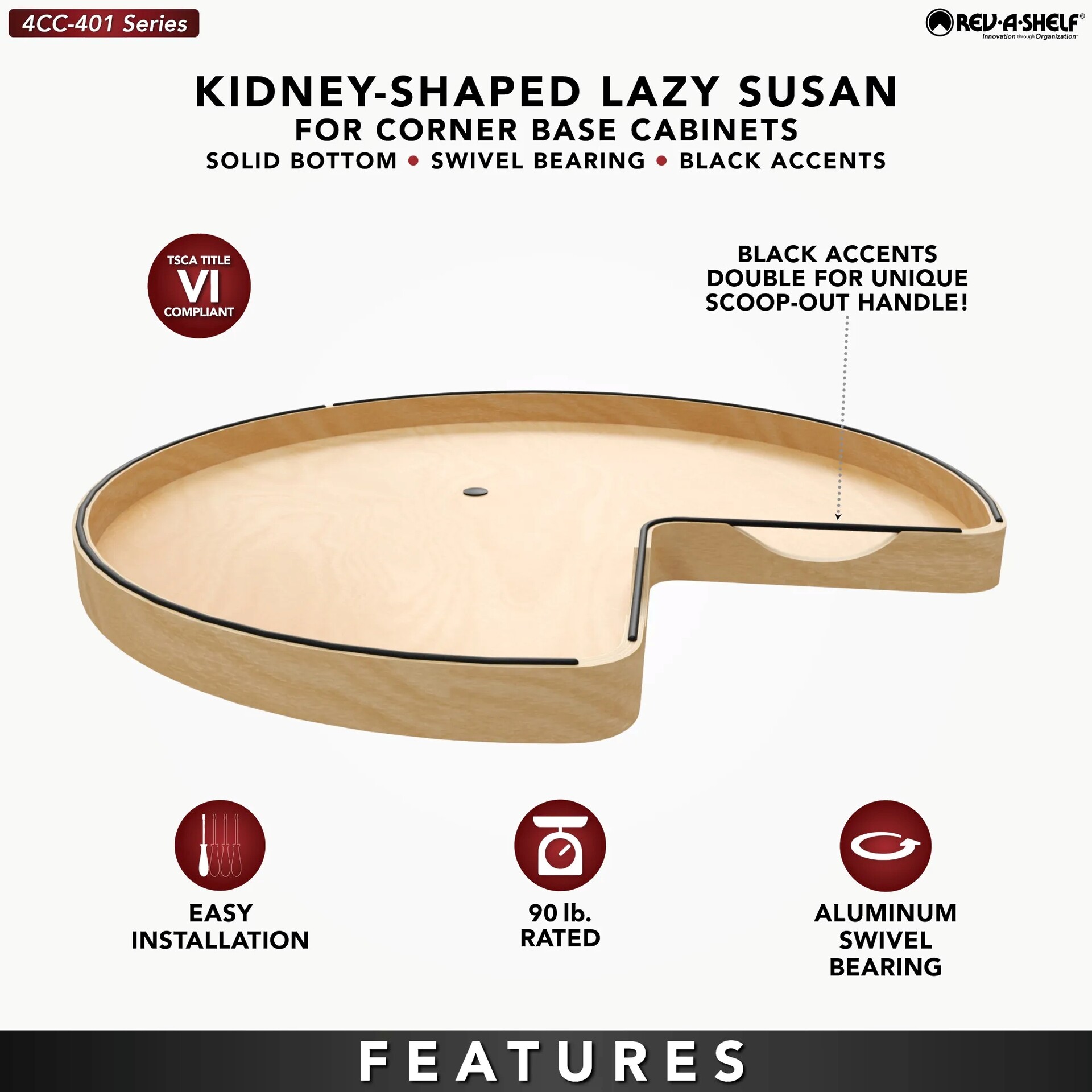 Put a new "spin" on your corner cabinet organization with the 4CC-401 Series Craftsman Collection Kidney-Shaped Lazy Susan. Features gorgeous maple construction and a distinctive curved design in the front that allows the recessed black wire accents to double as a handle for easy operation.
