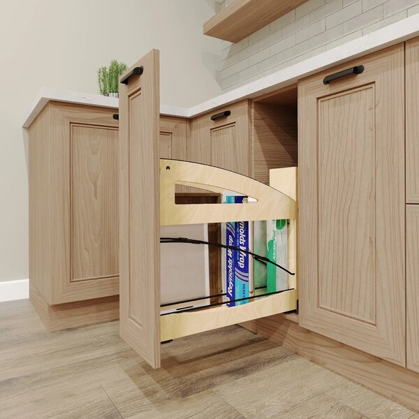 Organizing bakeware like cutting boards, trays, foil and plastic wrap doesn't have to be a chore. Make organizing fun with the Rev-A-Shelf® 447CC Craftsman Collection Base Cabinet Pullout. This organizer features that rich, distinctive Craftsman Collection look of visually appealing matte black round wire accents.
