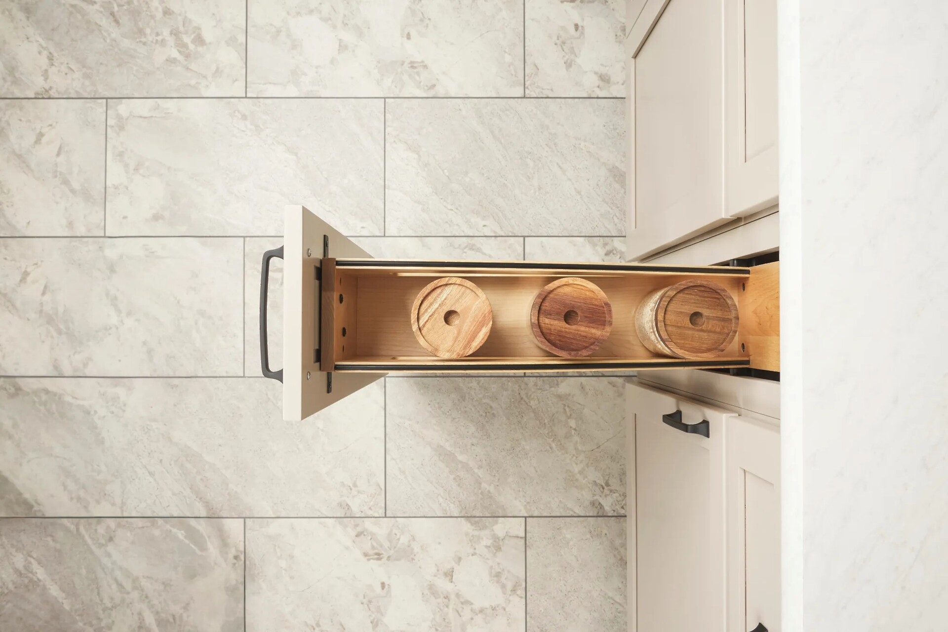 The classic 448 Series Base Cabinet Pullout Organizer has been beautifully reimagined with the 448CC Series, part of our sophisticated Craftsman Collection. This new design showcases clean lines, luxurious solid wood construction, and recessed black wire accents for a modern and elegant look. It includes a fixed top and bottom shelf, an adjustable middle shelf, and BLUM soft-close slides for smooth and quiet operation.