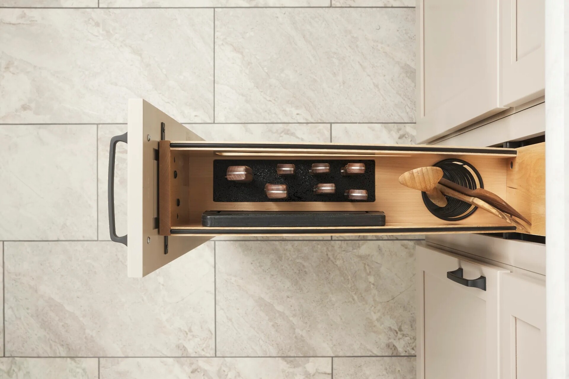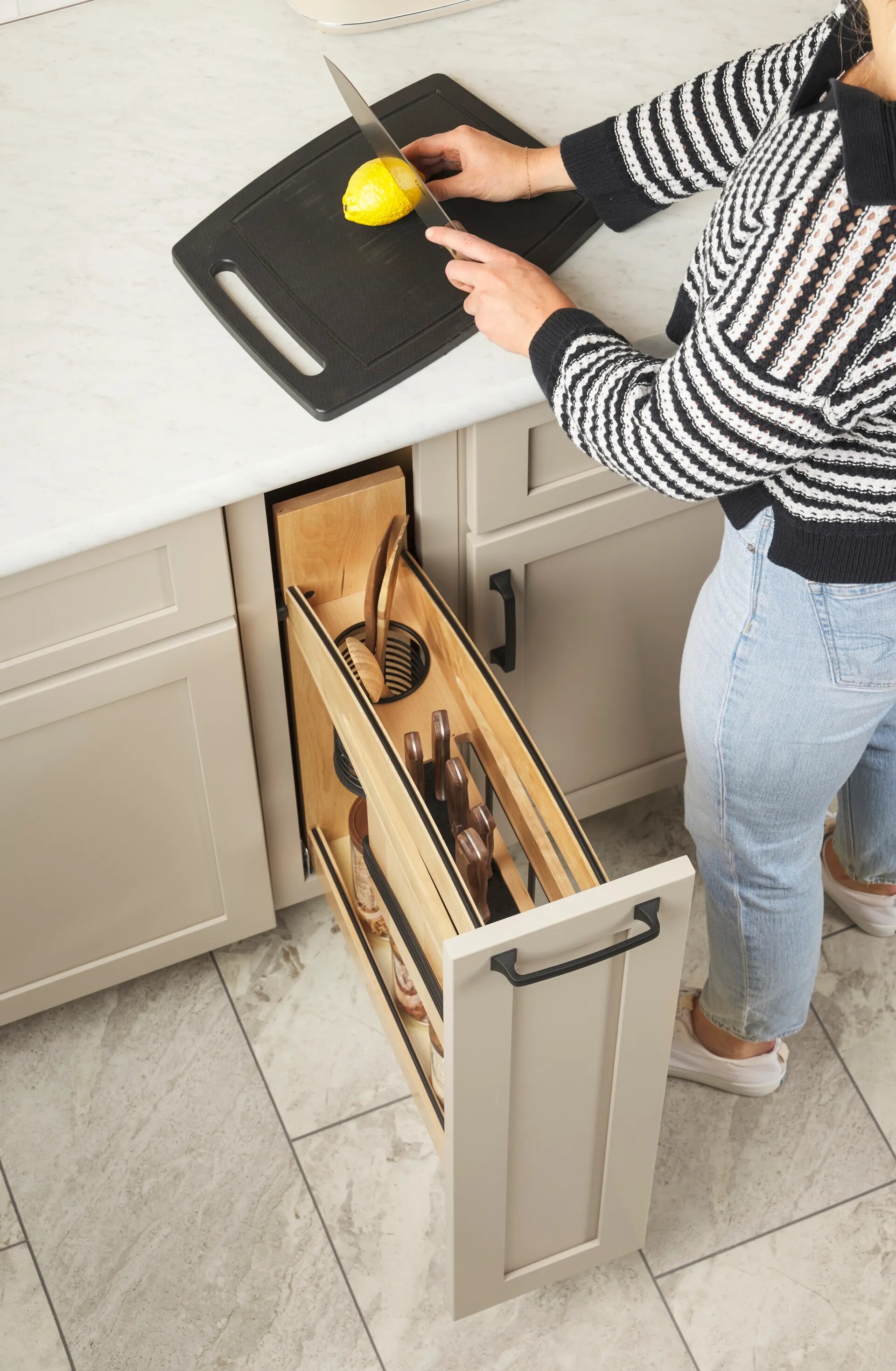 Streamline your kitchen organization with the 448KBCC Craftsman Collection Knife Block Base Cabinet Pullout. This innovative pullout combines solid maple construction with gorgeous soft edges, curved black wire accents, a removable wire utensil bin and up to two knife block inserts with Flex Rod Technology for a secure and stylish way to store knives, shears, and more.
