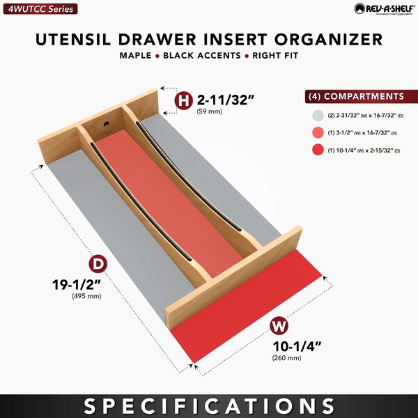 The 4WUTCC Series Craftsman Collection Utensil Tray Inserts by Rev-A-Shelf® offer a stylish solution for organizing your kitchen tools. Crafted from solid maple, these inserts effortlessly complement most cabinetry, while the recessed matte black wire accents add a modern touch. The distinctive curved design enhances functionality by providing both visual interest and greater accessibility to the drawer contents. Each insert comes with a durable black non-skid vinyl mat to keep your items securely in place. Enjoy easy, drop-in installation with no tools or trimming required.