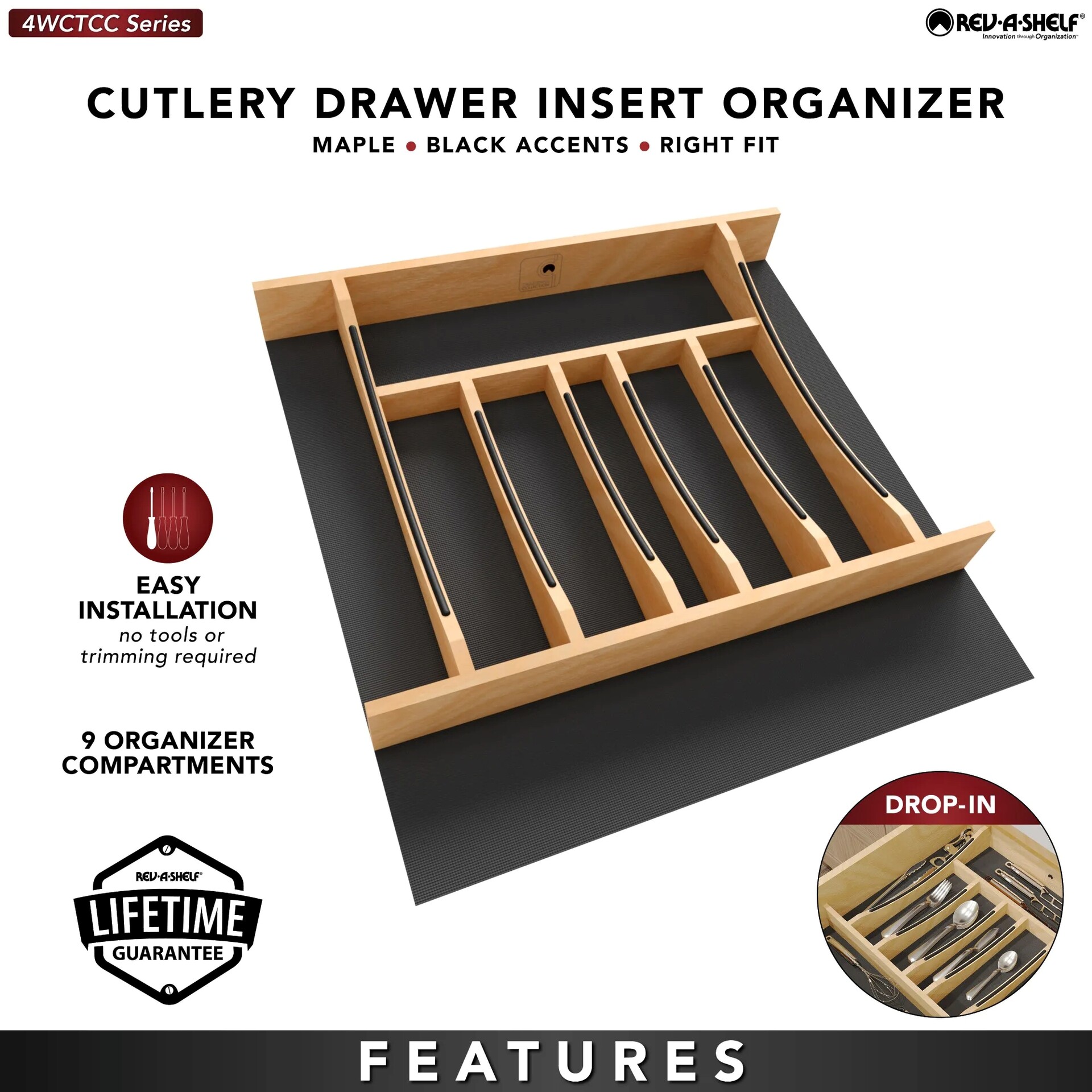 Now you can store your silverware in luxurious style with the 4WCTCC Series Craftsman Collection Right-Fit Cutlery Tray Inserts! These beautiful drawer inserts feature solid maple construction with a semi-gloss finish and recessed black wire accents for a stylish look that you can’t find anywhere else. The unique curved design provides both visual interest and even easier access to the contents of the drawer. Includes a removable black non-skid vinyl mat.