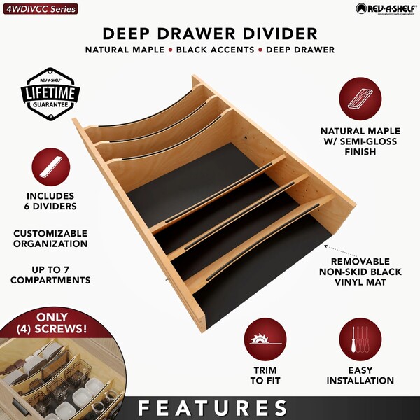 Are deep drawers driving you crazy? You are not alone! The 4WDIVCC Craftsman Collection Adjustable Deep Drawer Divider Inserts from Rev-A-Shelf® are sure to add organization without sacrificing style. Available in multiple trimmable sizes, these beautiful inserts feature solid maple construction and recessed black wire accents for a modern and refined appearance. The unique curved design seamlessly complements the rest of the Craftsman Collection while adding both visual interest and effortless access to the contents of the drawer. Installs in seconds with just four screws and includes up to six removable, adjustable dividers that can be positioned either at an angle or vertically, allowing you to create a truly customized organization solution.
