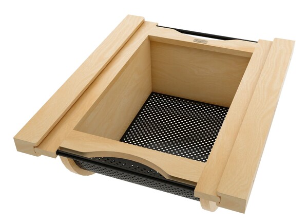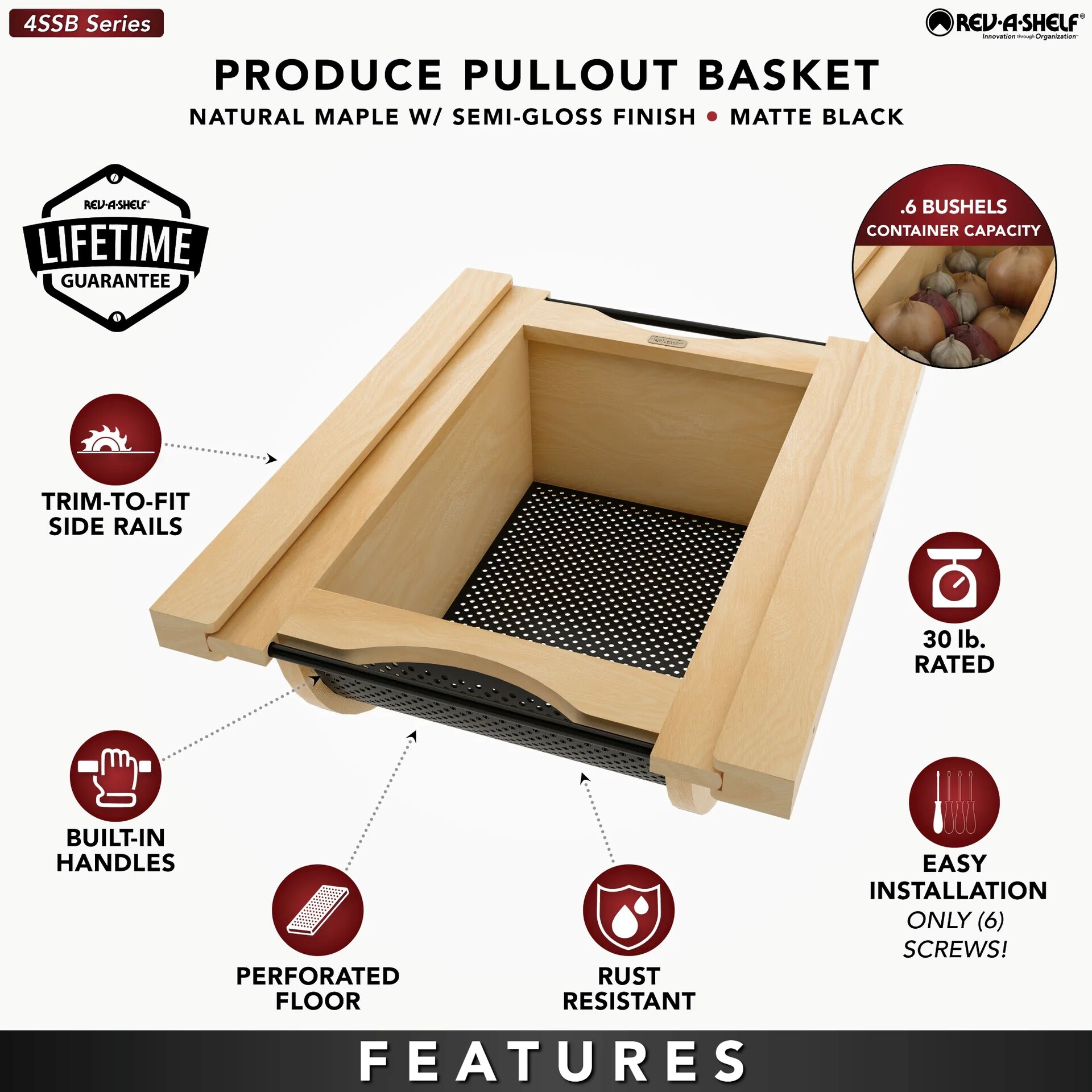Store your produce in style with the 4SSB Series Stainless-Steel Produce Baskets! These removable baskets are designed for base cabinets and intended for use without cabinet doors. They are available in your choice of walnut or maple construction and feature either a stainless-steel bottom with matching handles or a luxurious black bottom with matching handles. The perforated design promotes ample air circulation and prevents moisture buildup, keeping your fruits and vegetables fresher for longer. Enjoy simple installation with trim-to-fit side rails and easy transportation using the built-in handles.