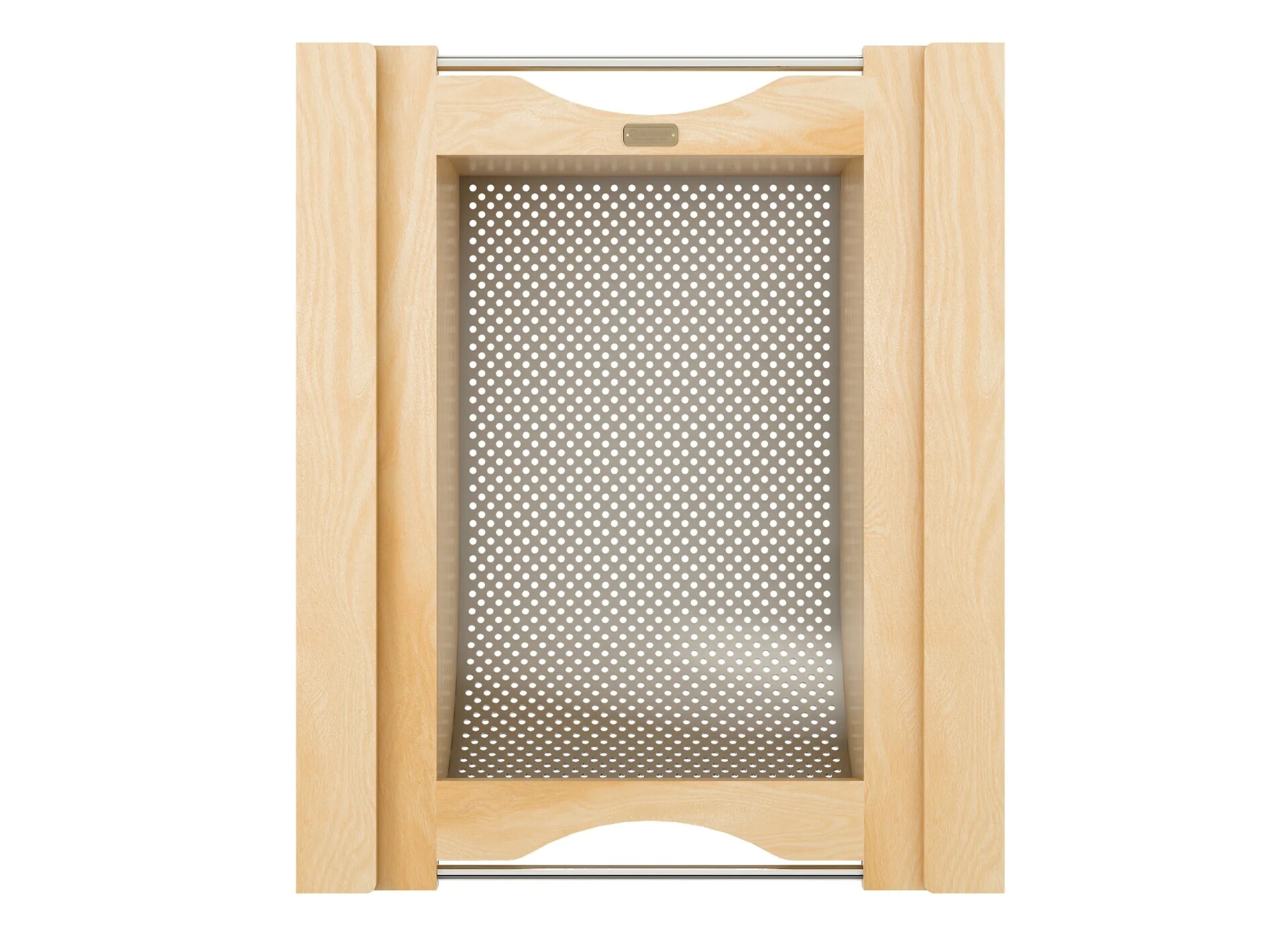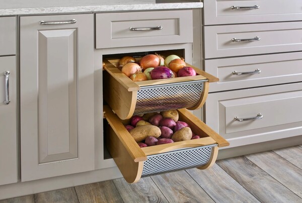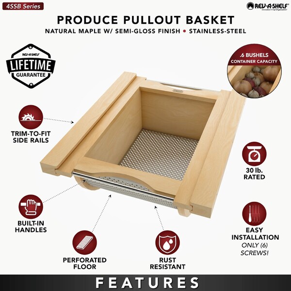 Store your produce in style with the 4SSB Series Stainless-Steel Produce Baskets! These removable baskets are designed for base cabinets and intended for use without cabinet doors. They are available in your choice of walnut or maple construction and feature either a stainless-steel bottom with matching handles or a luxurious black bottom with matching handles. The perforated design promotes ample air circulation and prevents moisture buildup, keeping your fruits and vegetables fresher for longer. Enjoy simple installation with trim-to-fit side rails and easy transportation using the built-in handles.