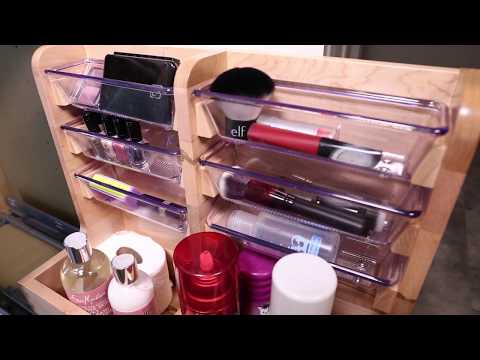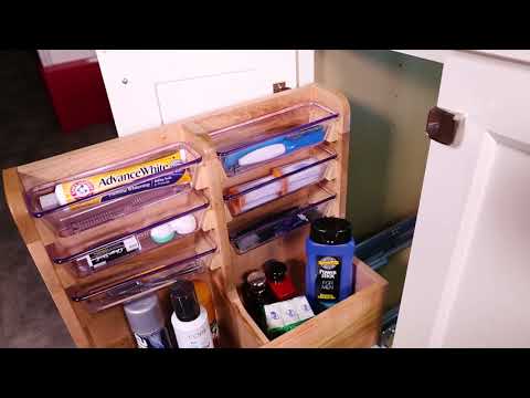 Conveniently store items while maximizing your under sink vanity space with Rev-A-Shelf's 441 L-Shaped Organizer. Designed for 24" and 30" vanity sink base cabinets and made of maple dovetail hardwood with a semi-gloss finish, this organizer features a unique reversible frame that can be mounted on the left or right to fit around obtrusive plumbing. It glides on TANDEM, 90 lb. rated slides with BLUMOTION soft-close and includes non-skid vinyl lining and acrylic bins.