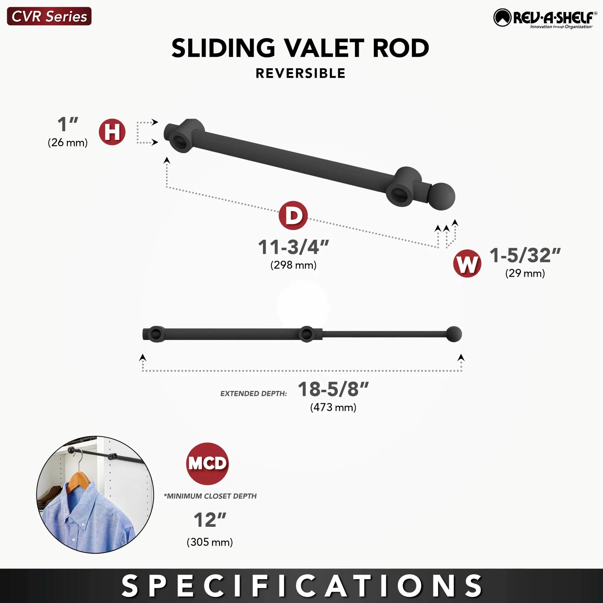 Rev-A-Shelf - 12" Chrome Valet Rod Designer