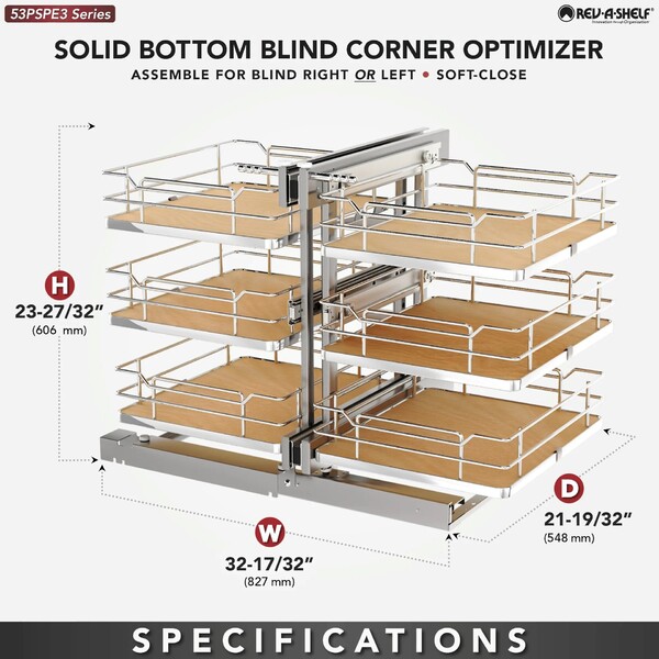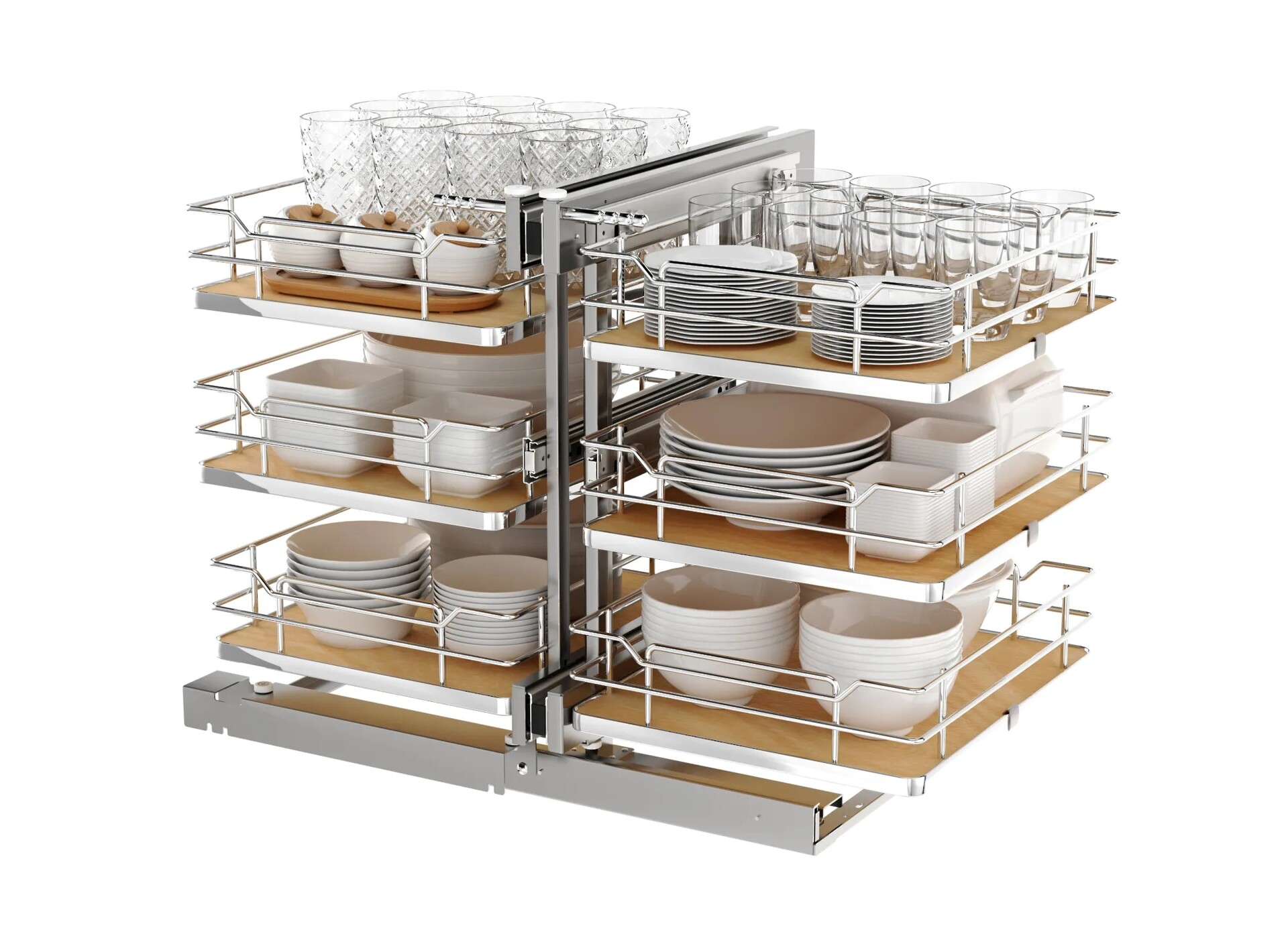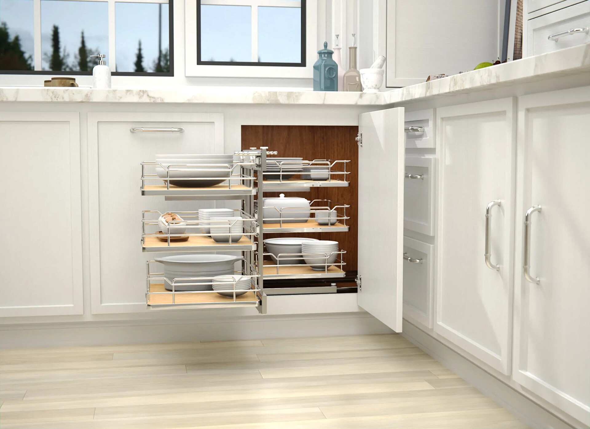 Give your blind corner cabinet an elite upgrade with the 53PSPE Series Elite Blind Corner Optimizer from Rev-A-Shelf®. This innovative solution takes functionality to the next level, featuring upper shelves that slide independently from the lower ones for easy access to every inch of your cabinet. Available in multiple sizes, finishes, and two- or three-tier configurations, this non-handed design ensures a seamless fit in both left- and right-handed applications, making installation a breeze.