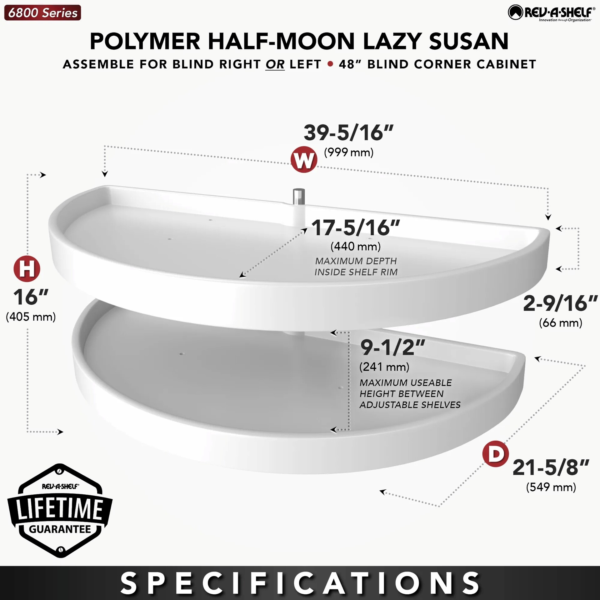 Rev-A-Shelf's polymer half moon organizers for base blind corners are revered as the best on the market. Whether you are replacing an old unit or just wanting to access your base corner cabinets, you will not be disappointed with the high quality design and the durable mounting hardware with ball-bearing slides.