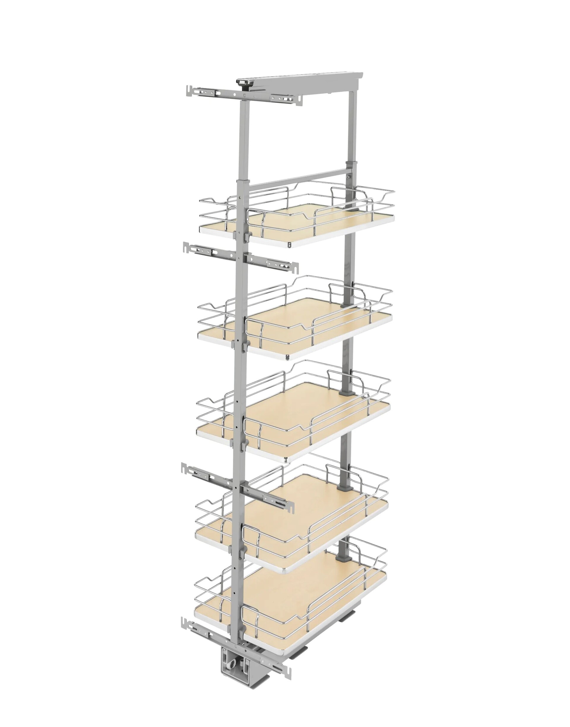 Rev-A-Shelf’s 5300 Pullout Pantry Series is the answer to your full access (frameless) cabinetry needs. The series offers basket depths for 24" deep cabinetry and comes in five different widths and four height ranges, one width available for face frame cabinets. Available in your choice of beautiful maple or contemporary gray solid bottom to match every kitchen style.