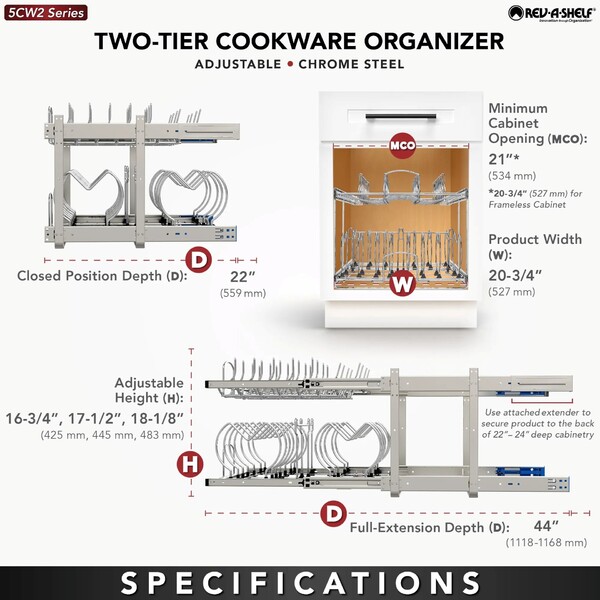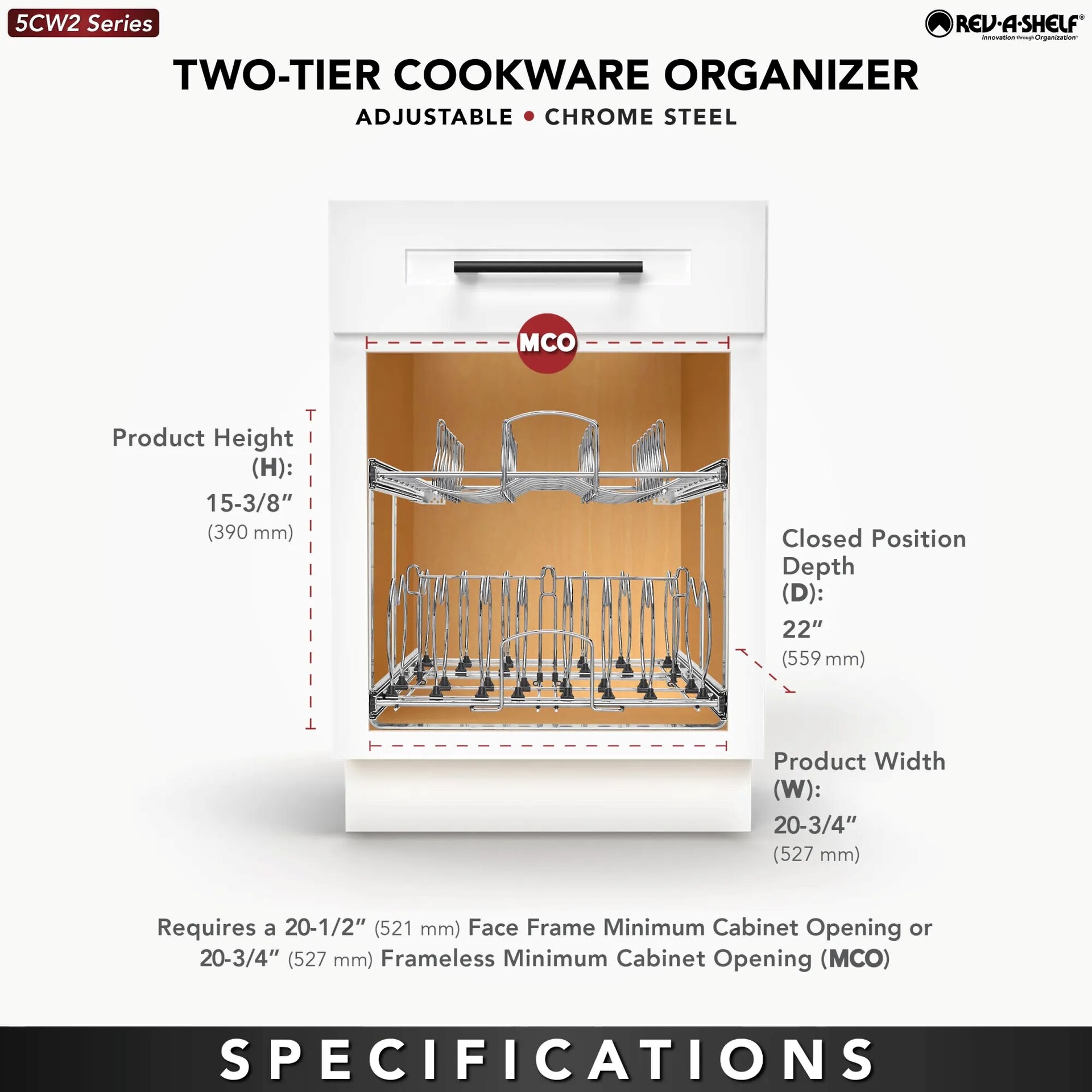 Revolutionize the way you store your pots, pans, and lids with Rev-A-Shelf's Two-Tier Cookware Organizer. The 5CW2 features independently operating shelves that accommodate a variety of cookware sizes and brands. The top tier organizes lids and the bottom tier features adjustable dividers to store a variety of large pots and pans. Made with a heavy duty chrome plated wire frame and 100 lb. rated full-extension soft-close ball-bearing slides. The bottom, side, and rear mounting provide you the sturdiness you expect and easy installation. Optional Door mounting kit available with the 5WB-DMKIT.