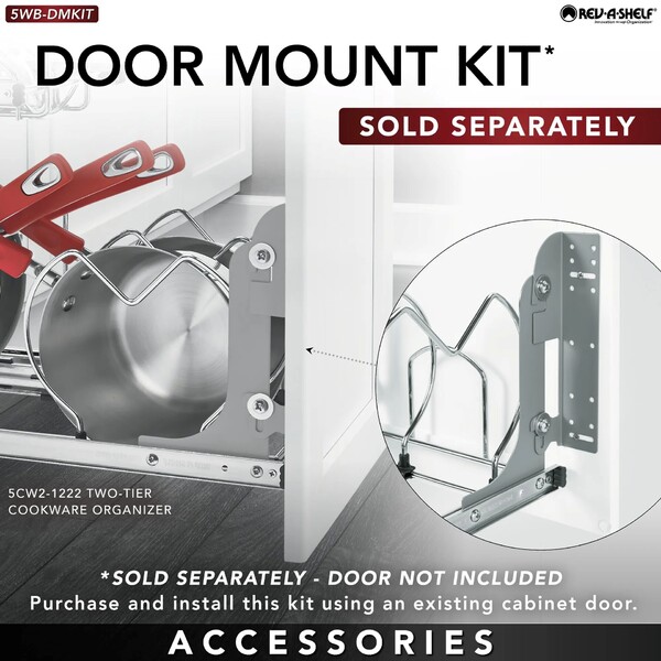 Revolutionize the way you store your pots, pans, and lids with Rev-A-Shelf's Two-Tier Cookware Organizer. The 5CW2 features independently operating shelves that accommodate a variety of cookware sizes and brands. The top tier organizes lids and the bottom tier features adjustable dividers to store a variety of large pots and pans. Made with a heavy duty chrome plated wire frame and 100 lb. rated full-extension soft-close ball-bearing slides. The bottom, side, and rear mounting provide you the sturdiness you expect and easy installation. Optional Door mounting kit available with the 5WB-DMKIT.