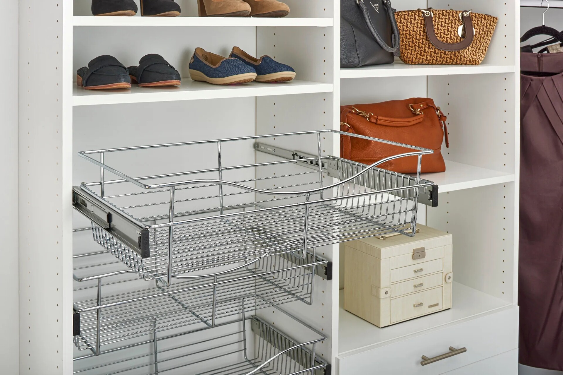 Rev-A-Shelf closet baskets are a perfect addition to bring your closet items to your fingertips. Available in multiple finishes and sizes, you will have no problem finding the right size for your custom closet system.