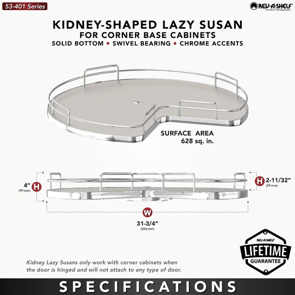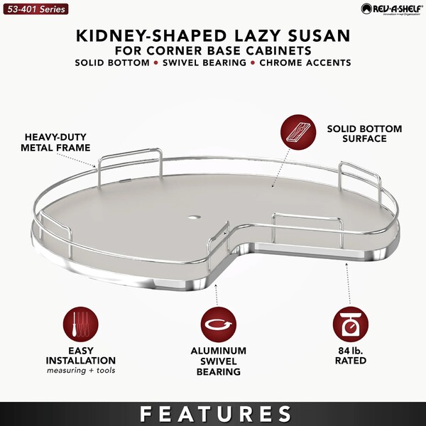 Maximize your kitchen's efficiency with the Rev-A-Shelf® 53-401 Series Kidney-Shaped Lazy Susan—an innovative solution for corner cabinet storage. These Lazy Susan shelves feature durable aluminum swivel bearings with a built-in stop for smooth rotation and effortless access. Available in multiple finishes and widths, they offer both style and functionality to transform your cabinet space.