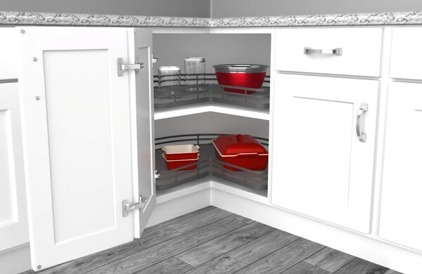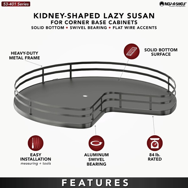 Maximize your kitchen's efficiency with the Rev-A-Shelf® 53-401 Series Kidney-Shaped Lazy Susan—an innovative solution for corner cabinet storage. These Lazy Susan shelves feature durable aluminum swivel bearings with a built-in stop for smooth rotation and effortless access. Available in multiple finishes and widths, they offer both style and functionality to transform your cabinet space.