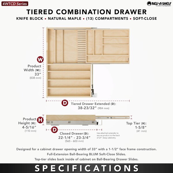 Double up your drawer space with Rev-A-Shelf's Two-Tiered drawer. This drawer box comes pre-assembled and ready to install into your existing cabinet drawer opening.