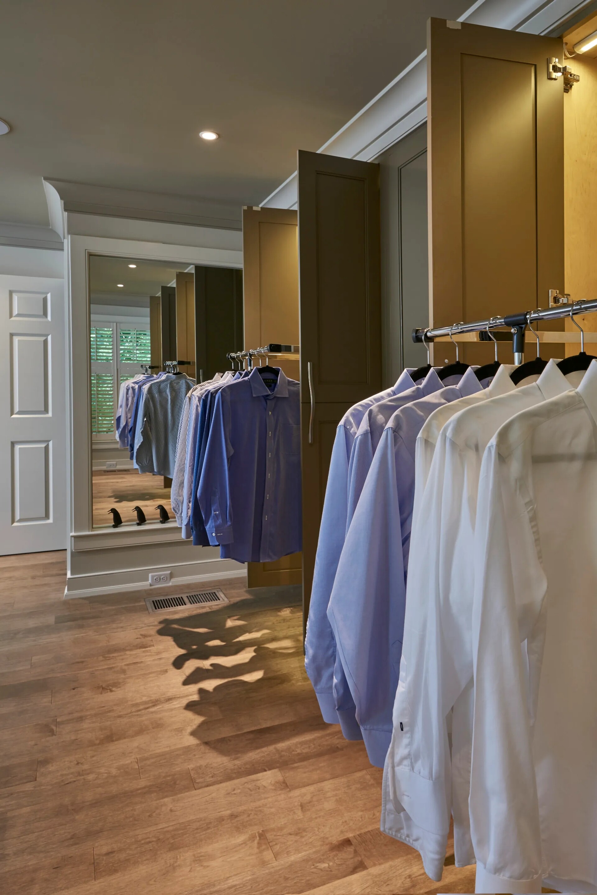 Rev-A-Shelf's side mounted, Pull-Down Closet Rod is available in three sizes and features an adjustable rod length to accommodate various openings depending on model. The telescoping pull-rod can be adjusted to the length that works best for you. It is adjustable from 34" to 50" to accommodate universal design and handicap accessible applications.