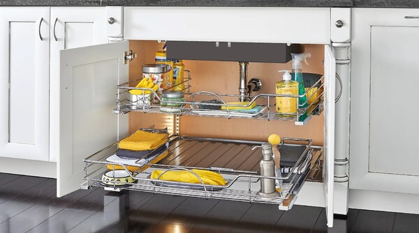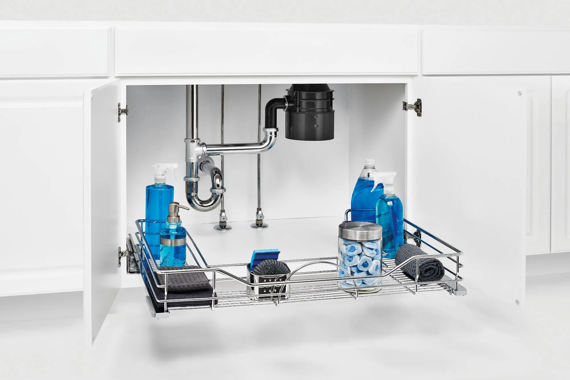 Obtrusive plumbing shouldn’t dictate your storage space. Update with a Rev-A-Shelf chrome wire pullout, outfitted with our unique U-Shaped frame that fits around the peskiest of pipes.