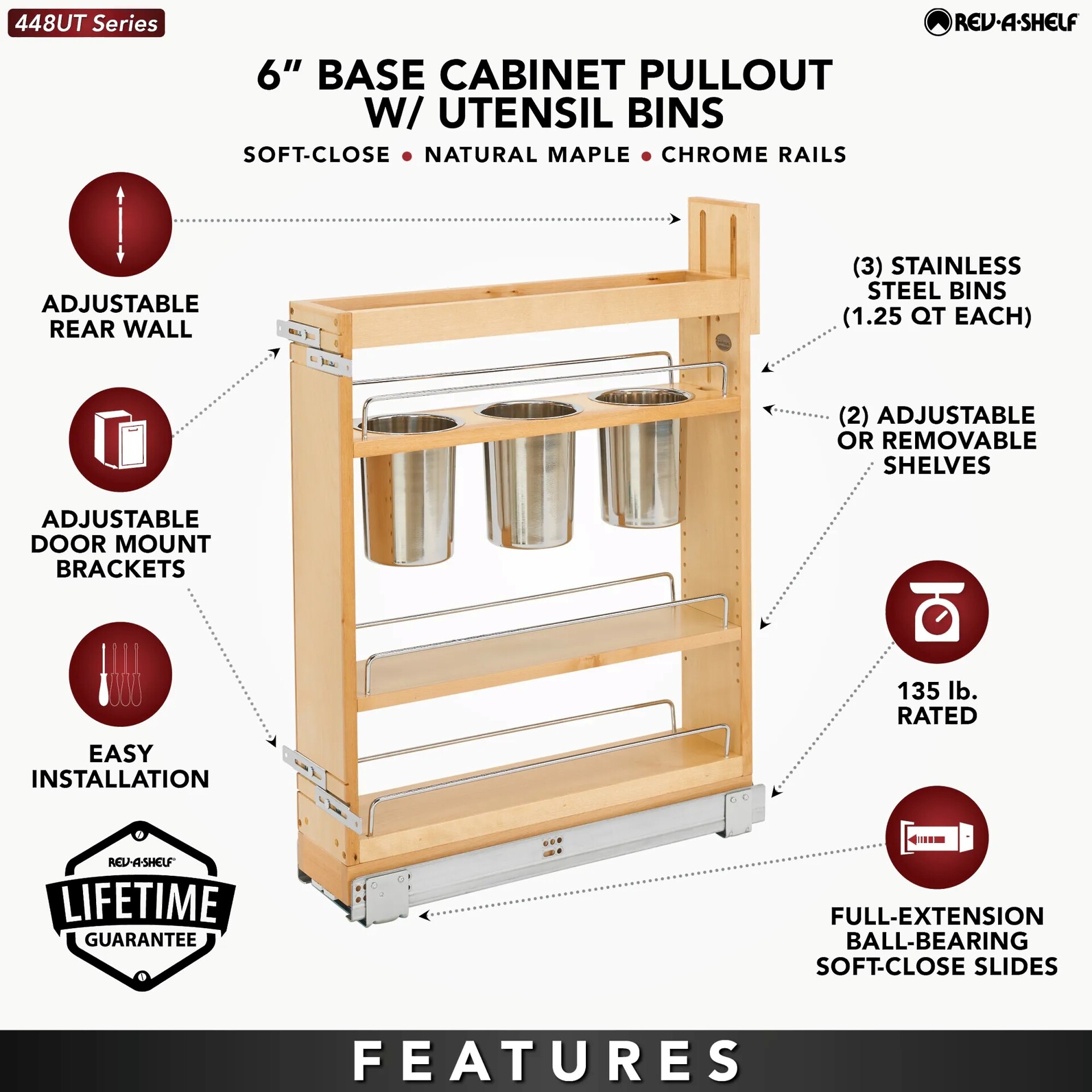 Rev-A-Shelf's beautiful base organizers feature adjustable shelves with chrome rails to help keep everything in its place. Stop digging through drawers for utensils and say goodbye to unsightly, space monopolizing counter bins with the 448UT pullout designed specifically for storing a multitude of utensils. Units glide out on the BLUMOTION soft-close slide system, which is some of the industry best slides. Door mounting is easy with our patented door mount brackets that provide up to 5 inches of flexibility for trouble free installation on any door style.