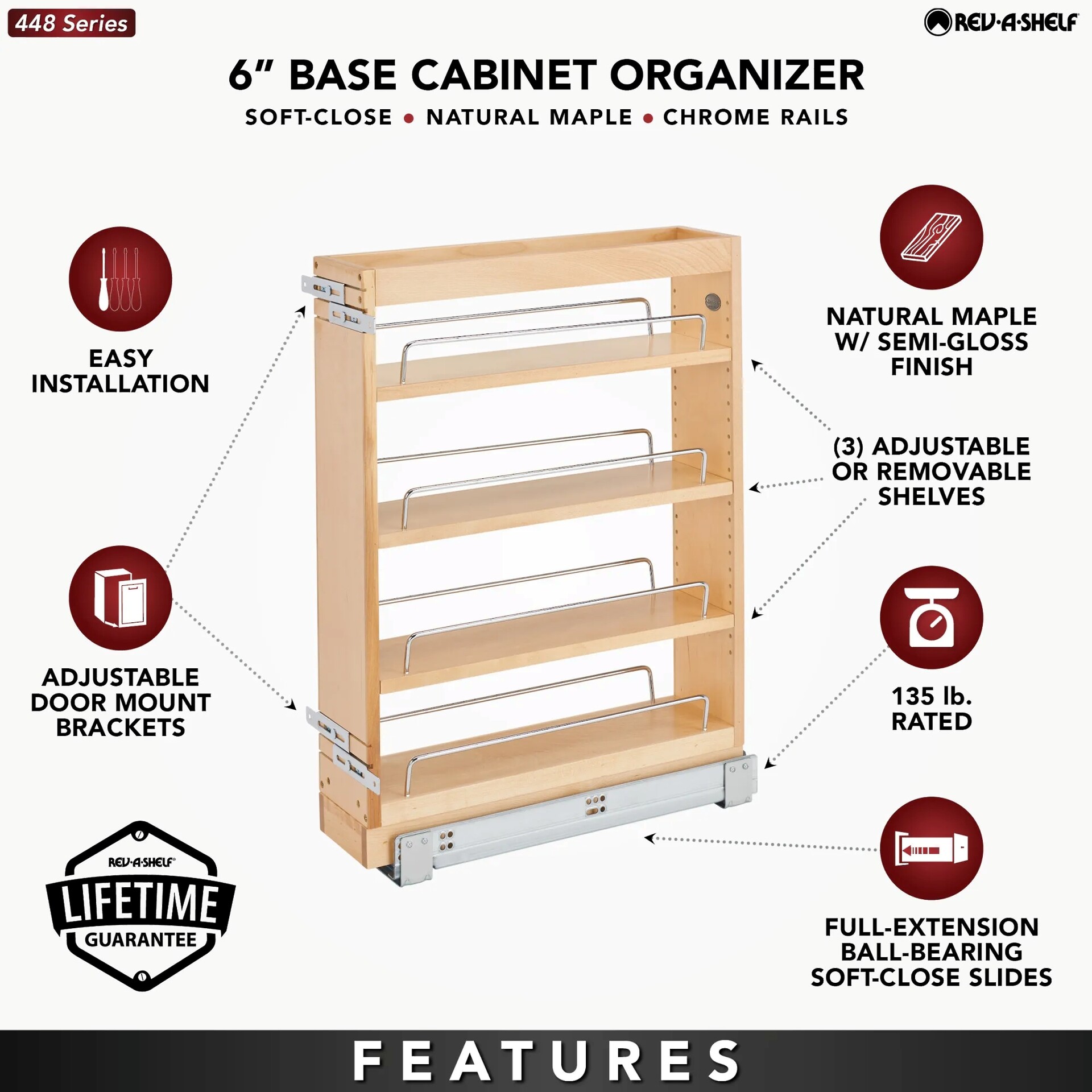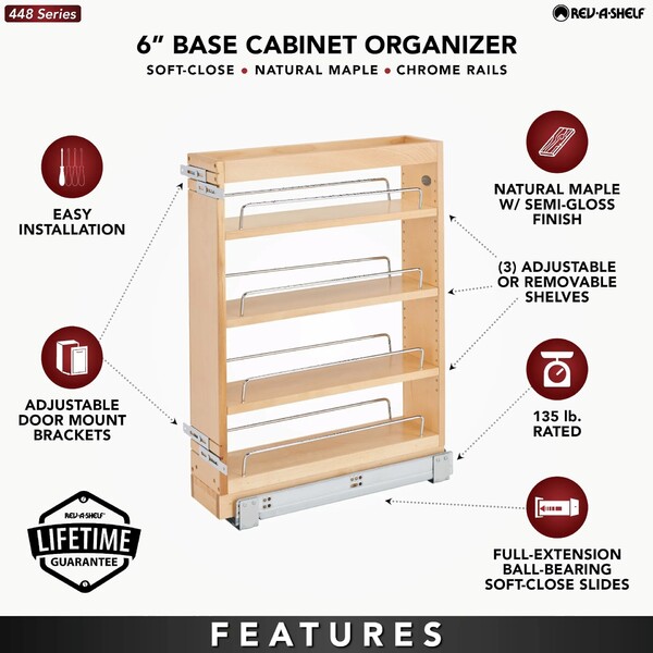 Rev-A-Shelf's beautiful base organizers feature adjustable shelves with chrome rails to help keep everything in its place. Units are available in two slide configurations ball-bearing or BLUMOTION soft-close. Door mounting is easy with our patented door mount brackets that provide up to 5 inches of flexibility for trouble free installation on any door style. These units are also available with an electric Servo drive system...simply tap the cabinet door and your unit pops out of the cabinet (electrical outlet required).