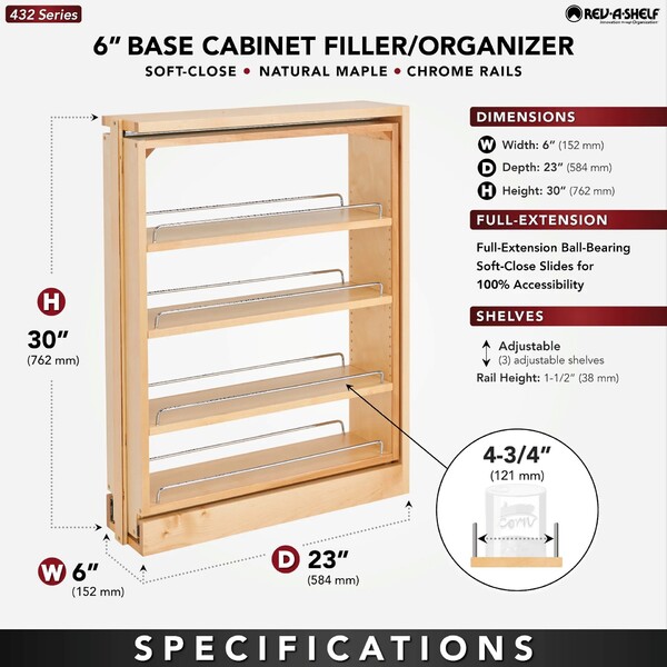 Rev-A-Shelf - 6" Filler Pullout Organizer with Ball Bearing Soft-Close