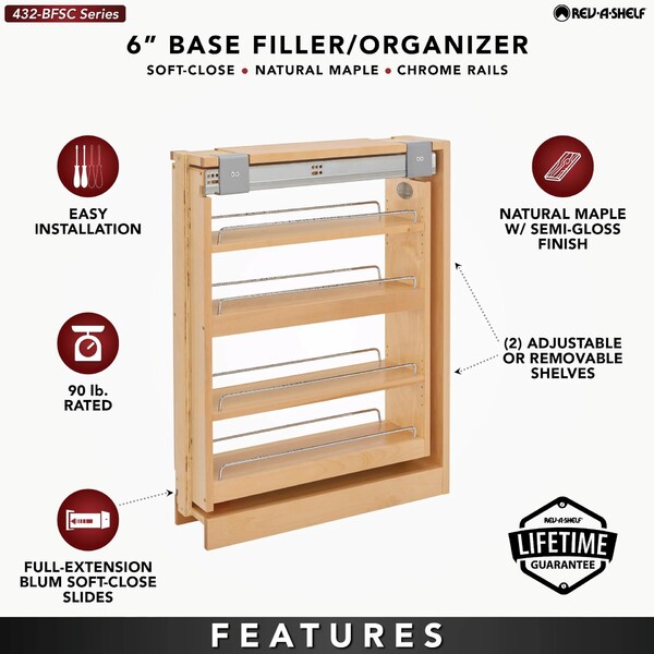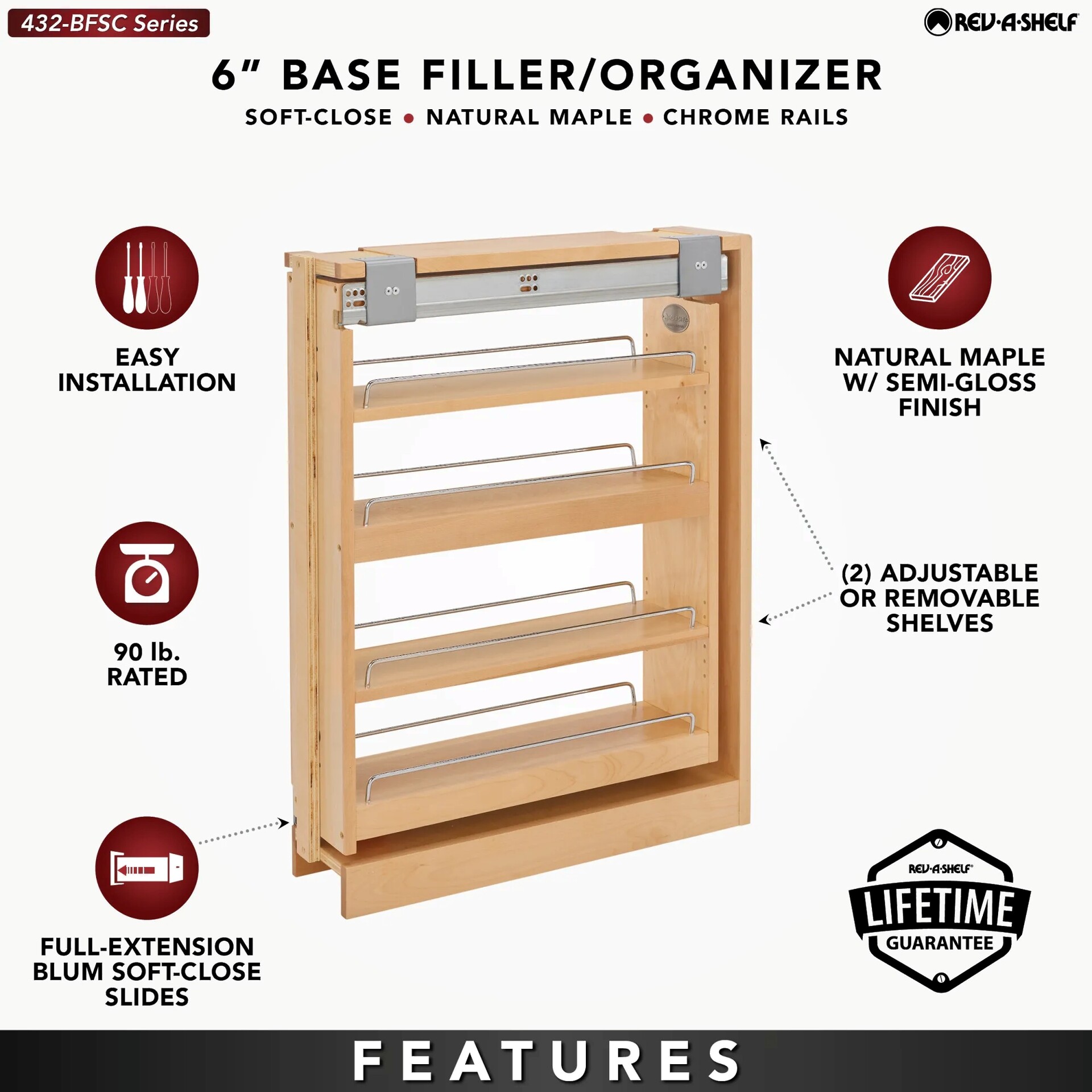 Add practicality to wider decorative fillers with the newest addition to our 432-BFSC Series: The 3", 6" & 9” Filler Organizer with Blum soft-close slides. What was once wasted space is now storage utopia, thanks to easily adjustable shelves with chrome-finished rails.