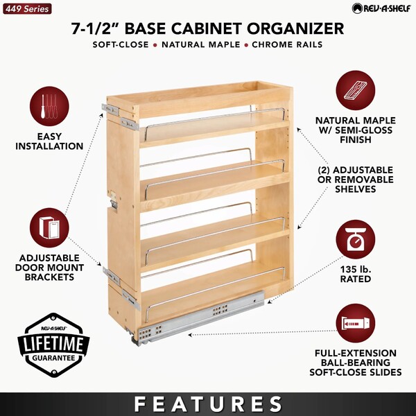 If you're tired of cluttered, unorganized and hard to access cabinets, then look no further than Rev-A-Shelf's bottom and side mount pullout shelving system. This innovative accessory pulls from the cabinet giving you complete accessibility and visibility. Available in varying sizes, they door mount..