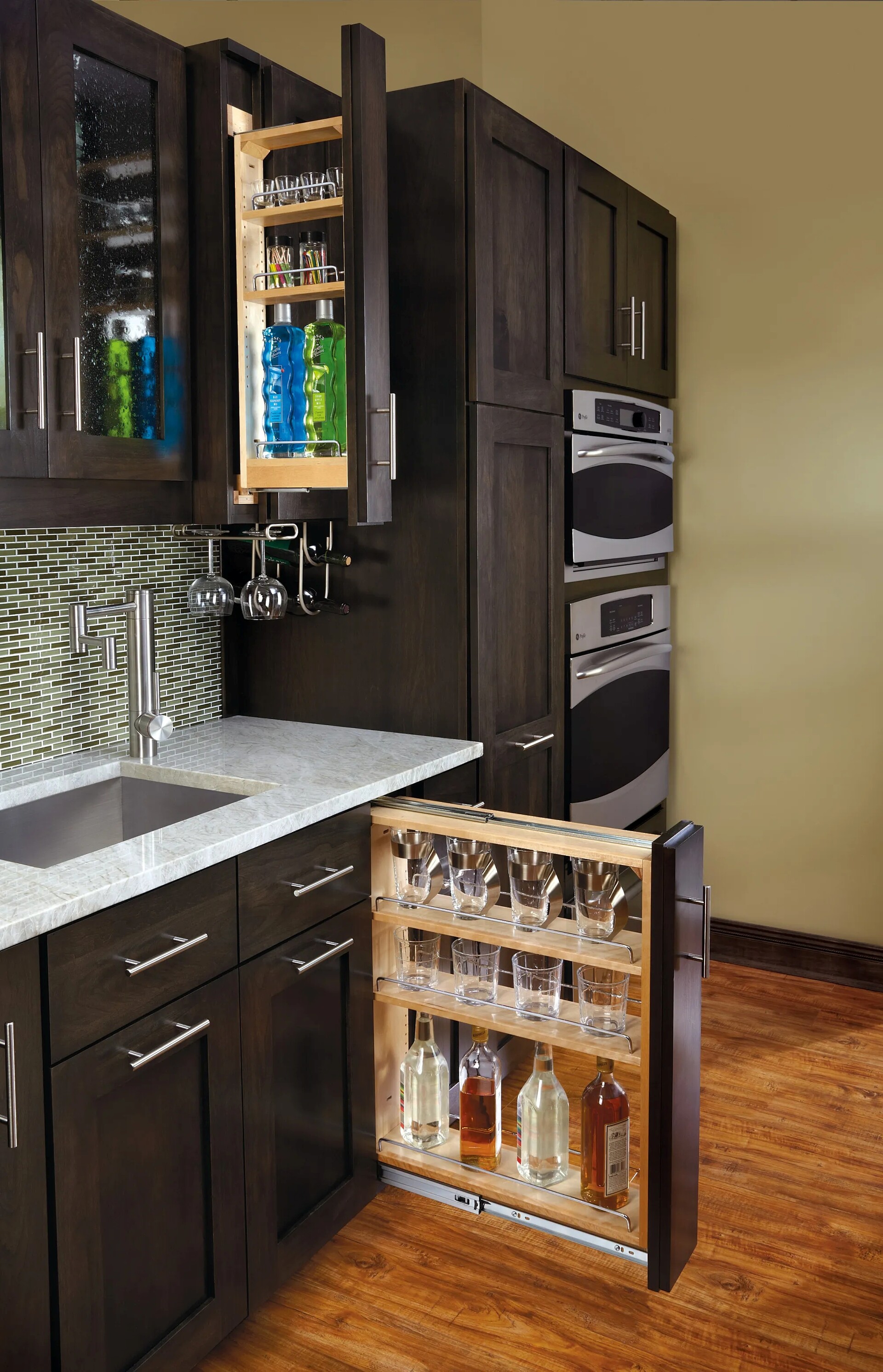 Create a functional storage space behind those decorative panels with this base filler cabinet. We didn’t’ just create another organizer...we created the whole cabinet that transforms decorative filler into useful storage pullouts. The 432 is available for 3”, 6” and 9” base cabinet applications and features adjustable shelves with chrome rails, full-extension ball bearing slides and our three slide design provides the most stable function on the market.