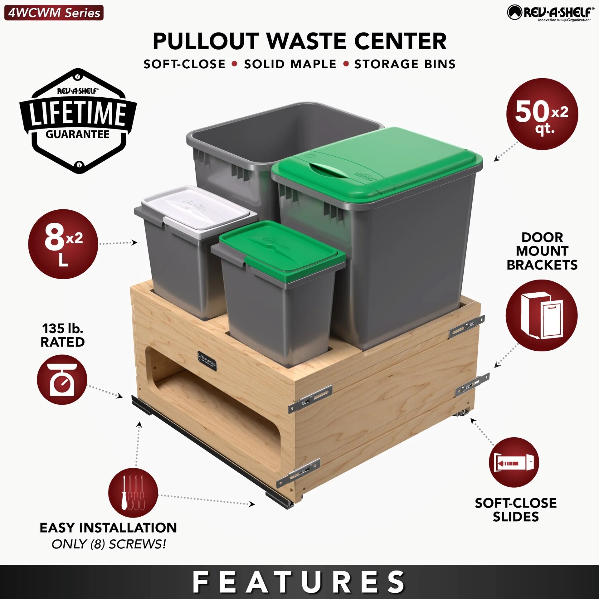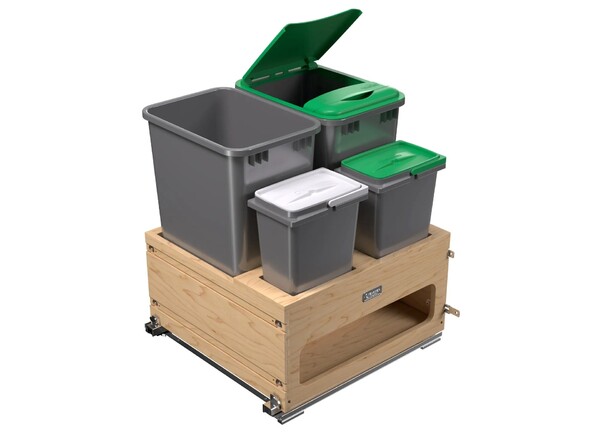 If you are looking for an all-in-one solution for your trash, recycling, and/or organic waste... your search is over! Rev-A-Shelf® is proud to introduce the 4WCWM Series Wood Bottom Mount Waste Management Center. Available with your choice of additional storage on the side or two 8 L containers (perfect for composting) held securely in place with a maple beauty ring, this pullout is a great addition to any kitchen. The maple dovetail frame glides on soft-close slides and boasts a reversible design with a side storage compartment.