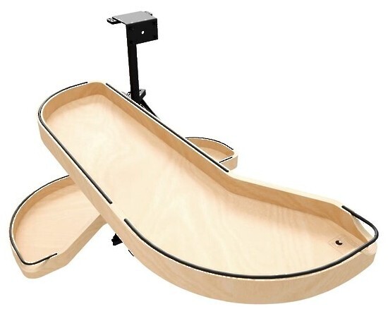 The 487CC Series Craftsman Collection "Girasolo" Blind Corner Optimizer by Rev-A-Shelf® offers a refined and sophisticated update to the classic Girasolo design. Crafted from maple with gracefully curved lines and soft edges, this innovative solution blends both elegance and practicality. The Girasolo glides effortlessly out of the cabinet on a soft-close pivot hardware system, eliminating the need for adjacent appliance clearance and maximizing accessibility. Designed for both right and left blind corner cabinet openings, it is available in multiple sizes and single or two-tier configurations, providing versatile storage options for hard-to-reach spaces.