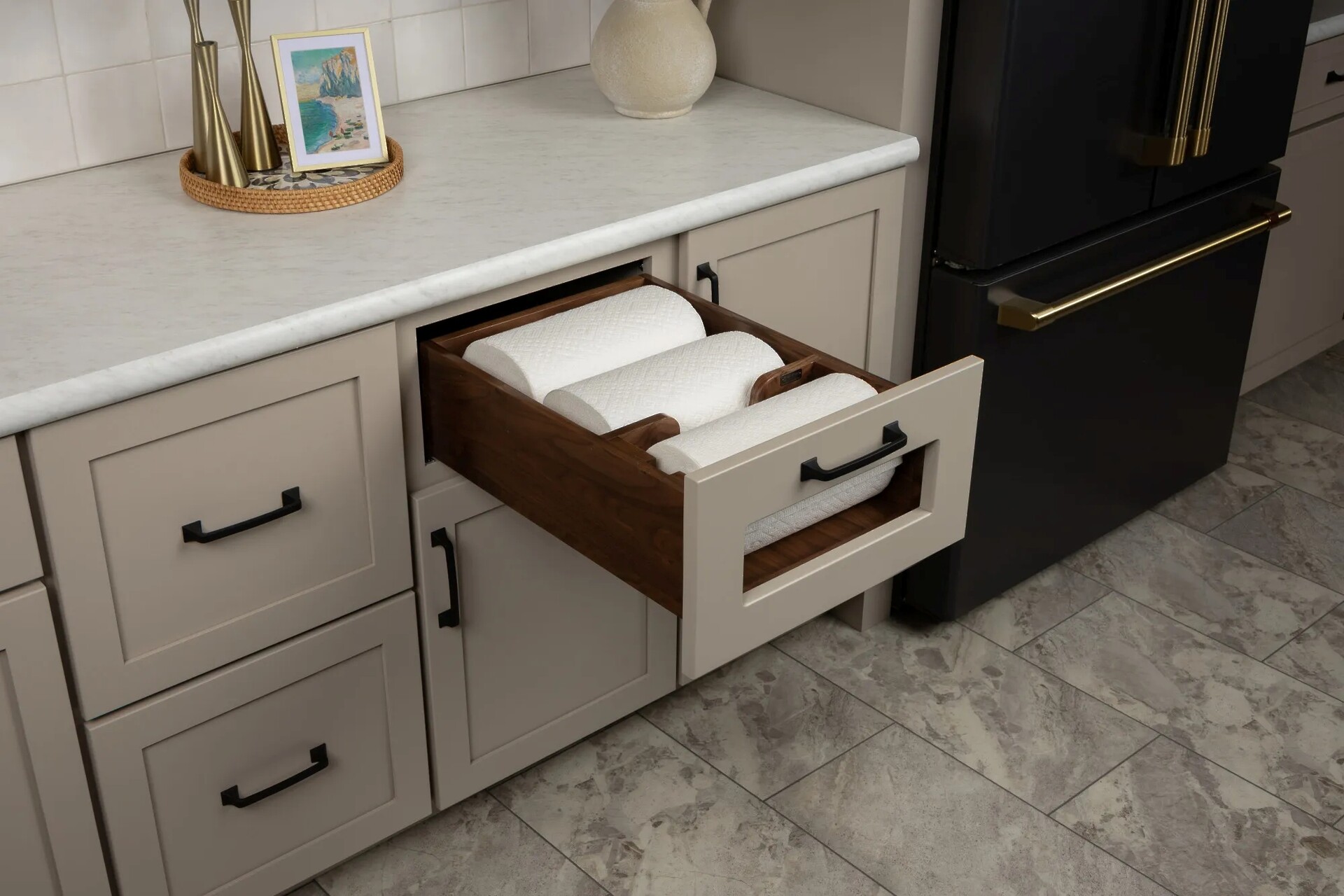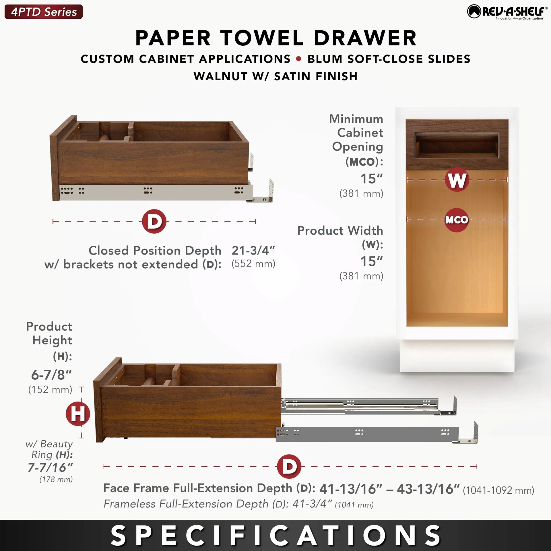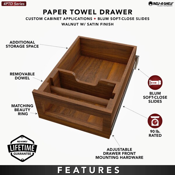Walnut Paper Towel Drawer System w/ BLUM Soft-Close Slides for 18 inch Base Cabinets