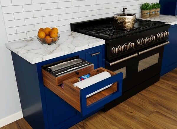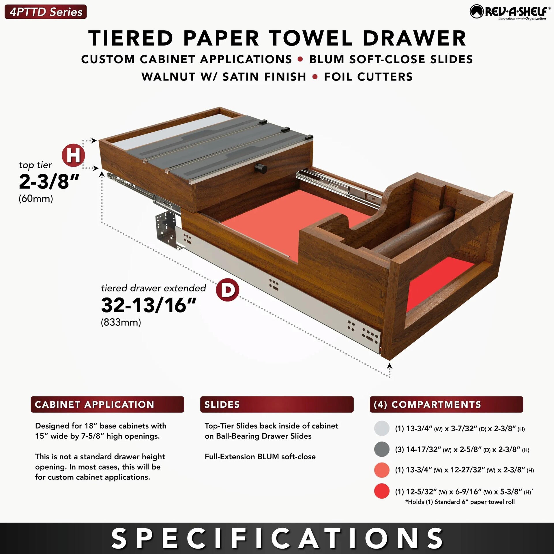 Walnut Wood Base Cabinet Paper Towel Tiered Drawer System w/ Foil Cutters and BLUM Soft-Close