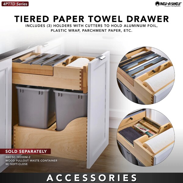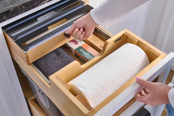 Wood Base Cabinet Paper Towel Tiered Drawer System w/ Foil Cutters and BLUM Soft-Close